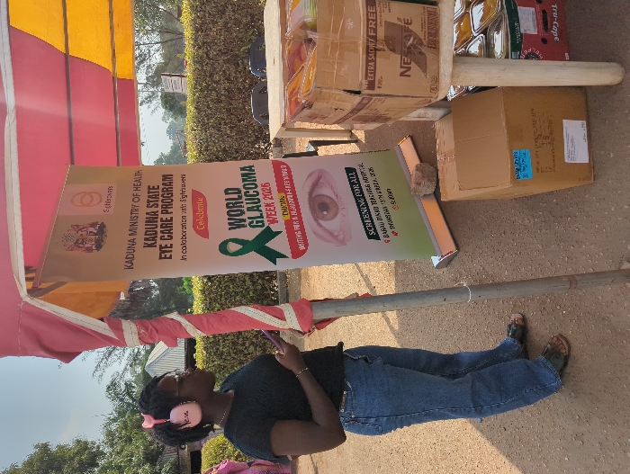 An outdoor scene in Unguwar Rimi, Nigeria, depicts an event setup for the Kaduna State Eye Care Program