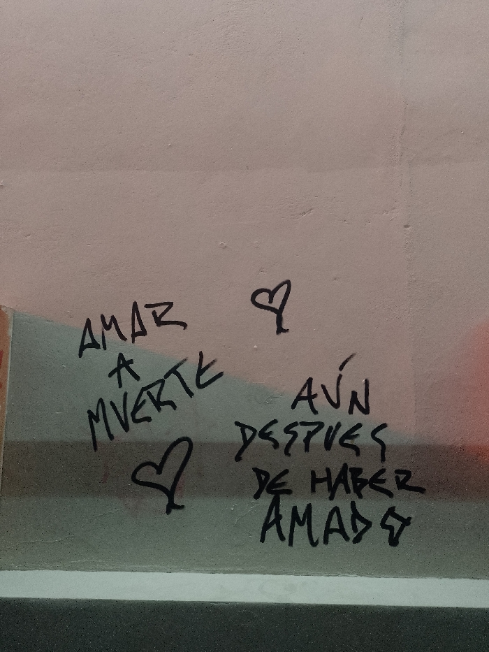 The image displays a segment of a painted wall marked with black graffiti. The upper portion of the wall presents a faded light pinkish-beige hue, while a horizontal line separates it from a darker, greyish-beige lower section. A subtle greenish-blue tint is discernible within the mid-lower area, and a faint orange-pink reflection is visible on the far right. The graffiti consists of three distinct elements: the Spanish phrase "AMAR A MUERTE" (Love to death) written in an upward-sloping orientation on the left; a small heart symbol positioned above and to the right of this phrase; and another heart symbol placed beneath it. To the right, a second phrase reads "AÚN DESPUÉS DE HABER AMADO" (Even after having loved). The text is handwritten in an informal style. The wall's surface exhibits a slightly textured appearance. The specific location within Buenos Aires, Argentina, cannot be ascertained from the visual evidence.