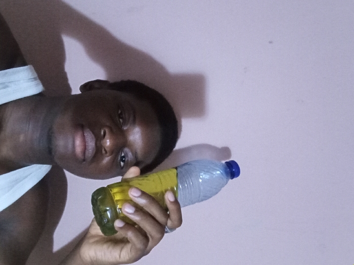 A person holds a plastic bottle containing a yellow liquid, possibly oil, against a pale pink wall. The bottle is partially filled, with clear liquid in the upper portion and a blue cap. The person has dark skin, short dark hair, and is wearing a white tank top. They are looking directly at the camera with a neutral expression. A shadow is visible on the wall behind them. The image is sideways.