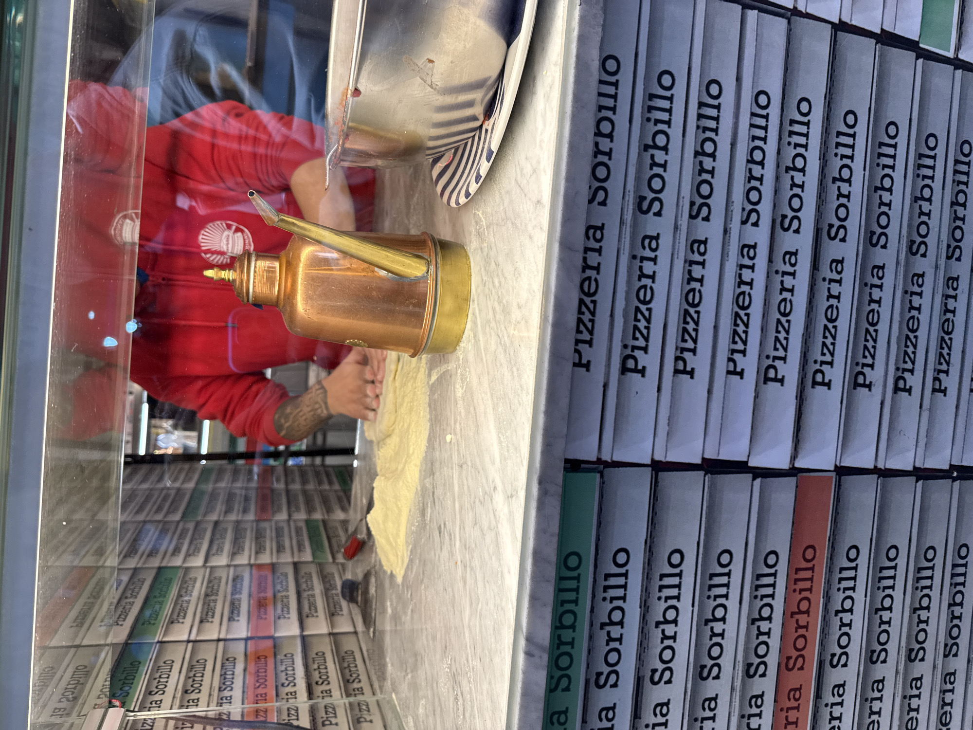 The image depicts a food preparation area, likely within a Pizzeria Sorbillo establishment in Naples, Italy