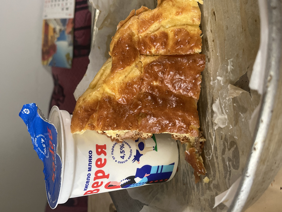 This image depicts a close-up view of food items positioned within a shallow, circular metal tray, lined with crumpled, grease-stained parchment paper, in an indoor setting located in Lozarevo, Bulgaria. The primary subjects are a white plastic cup of "Кисело мляко Верея" (Kiselo mlyako Vereya - Yogurt Vereya) and a wedge-shaped slice of golden-brown baked pastry, consistent with banitsa. The yogurt cup features a blue foil lid, partially peeled back and crumpled, revealing the white contents. The label on the cup displays text in Cyrillic, indicating "Yogurt Vereya," "from first quality cow's milk," and a 4.5% fat content, along with an illustration of a woman in traditional attire and a cow. The pastry, approximately triangular, has a glossy, rich golden-brown exterior. Its internal structure is visible where it is broken, showing layered dough and a reddish-brown, crumbly filling, suggestive of ground meat or a savory mixture. The pastry appears to have been partially consumed or broken apart, with crumbs and small fragments scattered on the parchment paper. White smears, consistent with spilled yogurt or a creamy substance, are visible on the parchment paper lining the tray, particularly towards the bottom right. In the out-of-focus background, a reddish-brown patterned fabric is visible, behind which a white item, possibly a calendar or printed material with small text and an image, is discernible. No people are visible in the scene; consumption of the food items is implied.