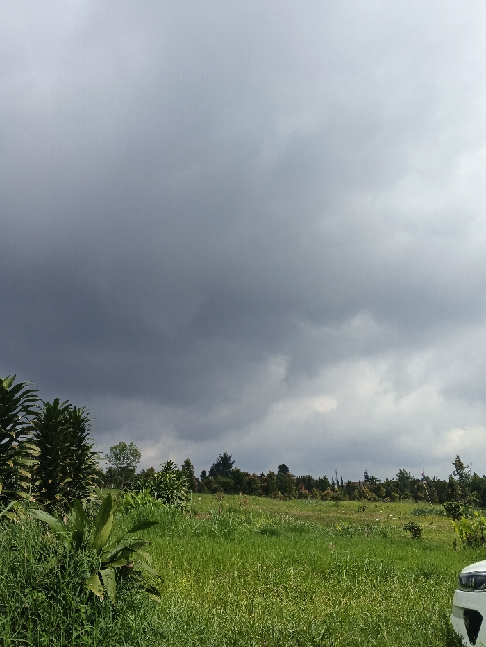 The scene is located in Mong Pun Teing, Myanmar. The image depicts an outdoor landscape under a heavily overcast, dark grey sky that dominates the upper two-thirds of the frame, with lighter grey clouds visible towards the upper right. The immediate foreground on the left features dense green vegetation, including tall grasses and broad-leafed plants. The front-right corner shows the white front bumper and part of a headlight of a vehicle. The midground consists of a wide expanse of vibrant green field covered in tall grass. A line of various trees and shrubs forms the background, delineating the horizon. No individuals or specific actions are discernible within the frame.