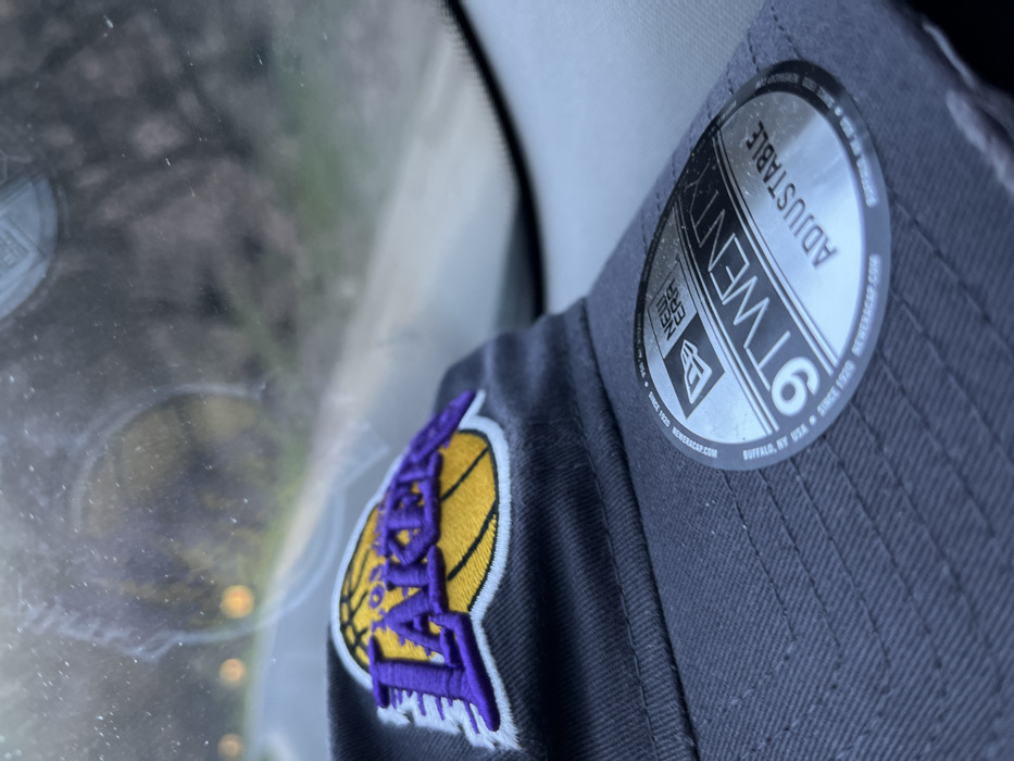 - "This image displays a grey New Era 9TWENTY adjustable baseball cap, emblazoned with an embroidered Los Angeles Lakers logo in purple and gold on a white outline" by FM-kP6T42, licensed under CC BY 4.0