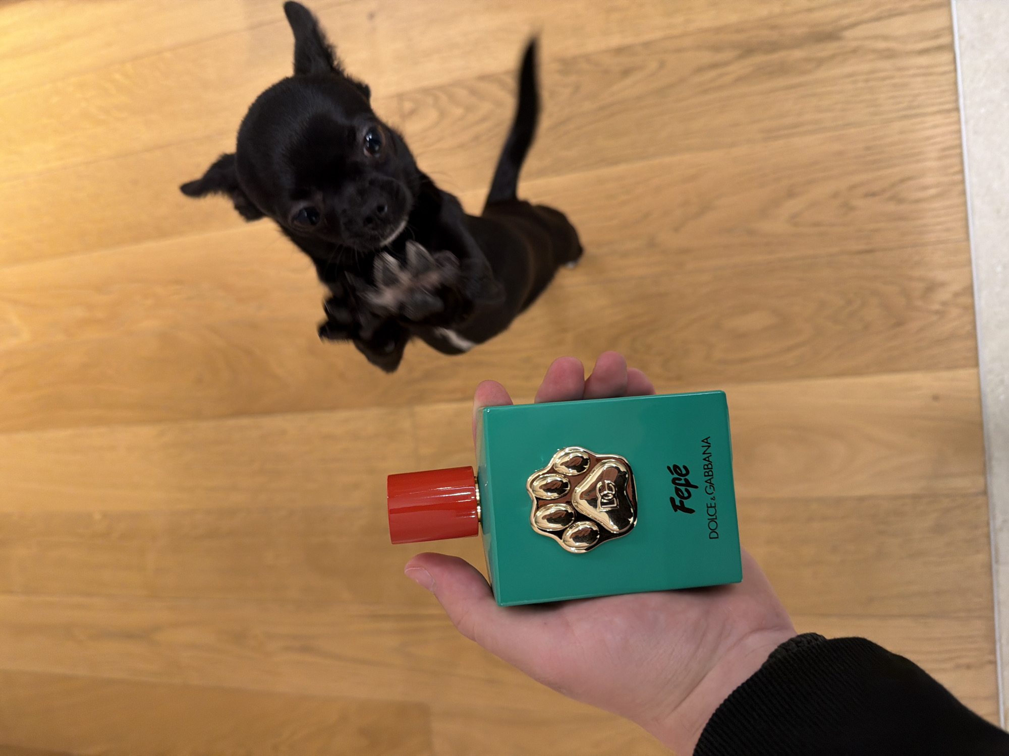 A human left hand, wearing a black cuff, holds a rectangular, teal-colored perfume bottle with a red cap. The bottle features a prominent gold paw print emblem with "DG" inscribed, and the text "Fefé DOLCE & GABBANA" below. To the right, a small black dog, appearing to be a Chihuahua, stands on its hind legs with front paws raised, looking upwards towards the bottle and hand. The environment is an indoor setting with a light wood plank floor. The specific location within Boreti, Montenegro, is not discernible from the image.