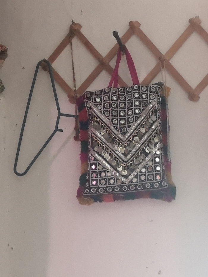The image displays an indoor scene in Unknown, Unknown, featuring a light-colored wall with minor blemishes. A wooden, accordion-style peg rack, extended horizontally, is mounted on the wall. From one of the central pegs, a rectangular bag is suspended by a magenta fabric strap. The bag is black, extensively decorated with small, circular mirrors arranged in a grid pattern, and features multiple silver-colored metallic sequins forming chevron designs, particularly in the lower half of its visible surface. Colorful fringe in shades of red, green, and yellow borders the bag's sides and bottom. To the left, a dark-colored, triangular wire clothing hanger hangs from another peg on the wooden rack. A thin metallic chain is draped over a peg near the bag. A small, multi-colored decorative object is partially visible on the far left.