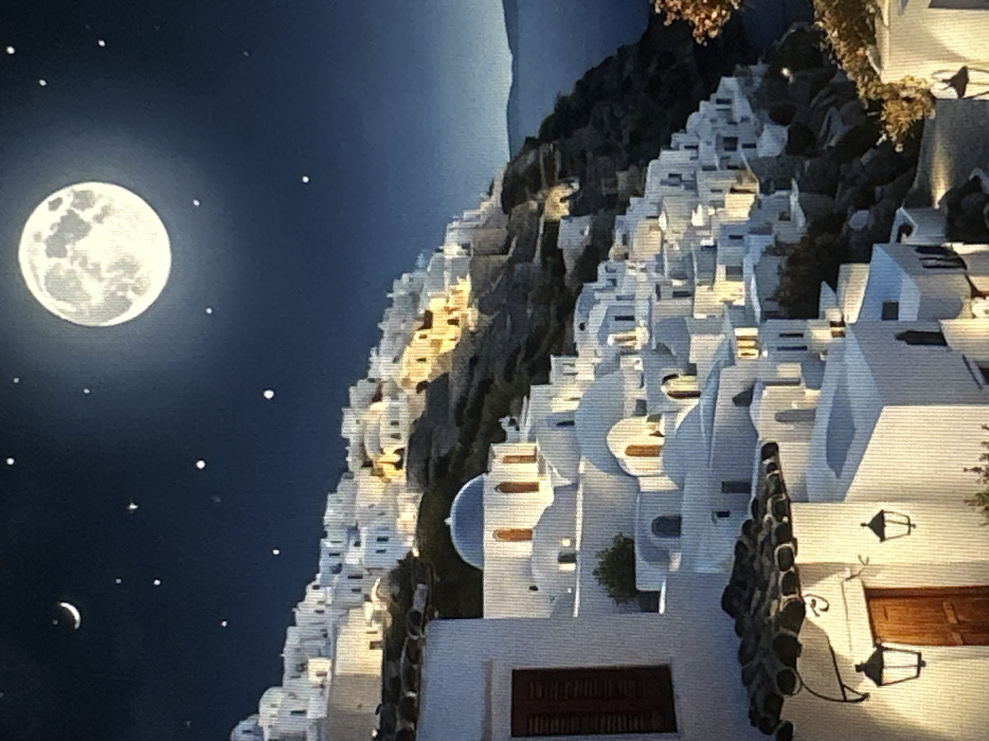 A nighttime scene depicts a dense arrangement of white, rectilinear buildings, some with blue domes, terraced along a steep, rocky hillside