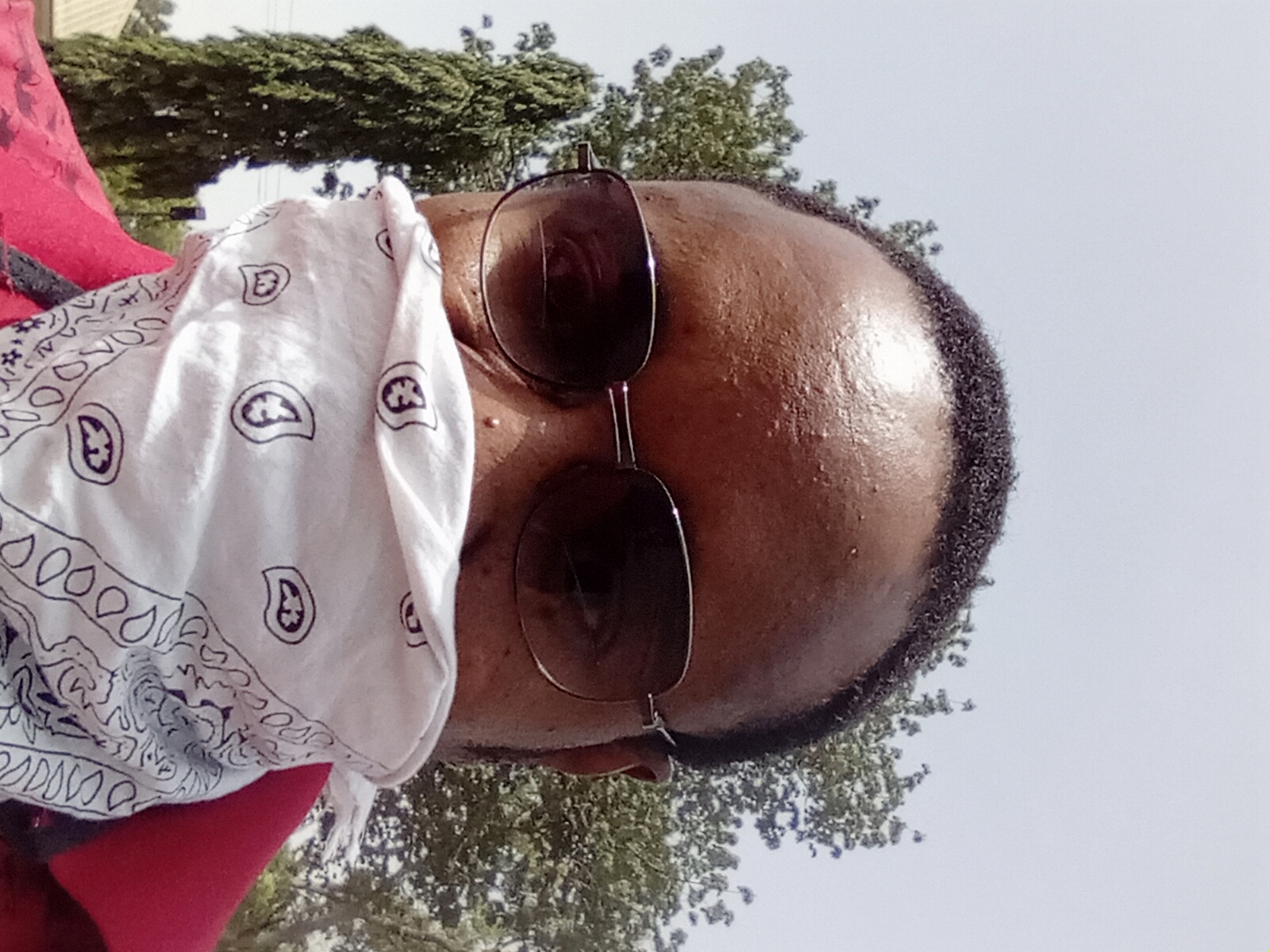 A close-up, frontal photograph taken outdoors in Gombe, Nigeria, depicts an individual of dark complexion wearing dark-lensed sunglasses with metal frames and a white bandana featuring black paisley patterns covering the nose and mouth. The subject has short, dark, curly hair. A red collared garment is visible on the lower right. The forehead appears shiny, indicating perspiration. The background consists of a clear, light blue sky, green foliage from deciduous trees, and a tall, slender coniferous-like tree on the left. A light-colored roof structure is partially visible in the lower-left background.