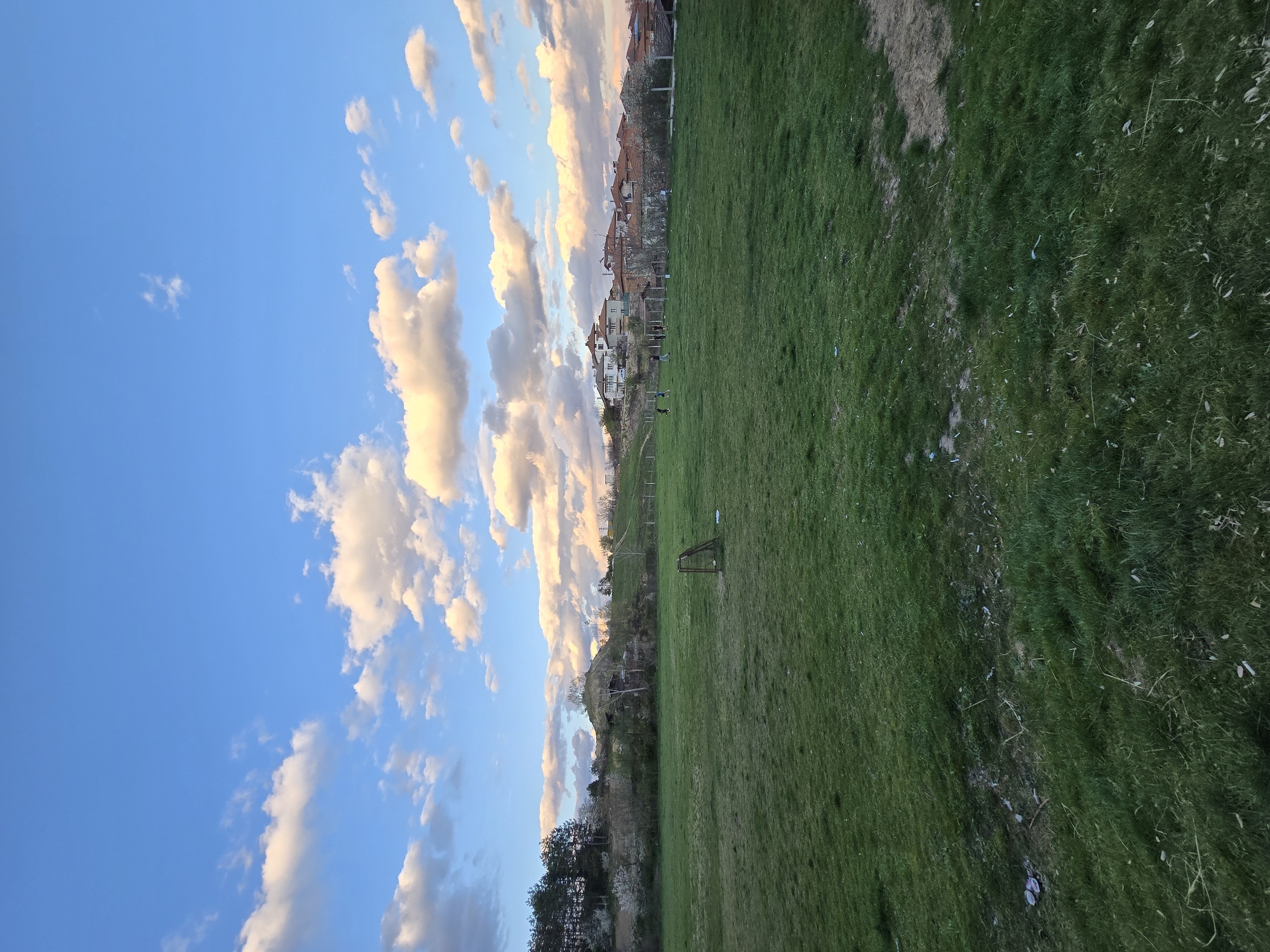 A horizontal landscape photograph shows a bright blue sky dotted with fluffy, white clouds tinged with gold from the setting sun. The sky transitions into a green field occupying the majority of the scene. The field stretches to a line of houses and buildings at the top center. A single soccer goal is visible in the center of the field. The image appears to be captured at dusk. The scene depicts Borovo, Bulgaria.