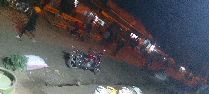 A dimly lit night scene shows a red motorcycle parked on the side of a road. Several stalls are visible in the background, illuminated by orange lighting, with people milling about. To the left of the motorcycle, there's a bag of leafy greens and a few bins. The overall image is grainy and appears to be taken from a low angle. The ground looks like a mix of dirt and paved areas.