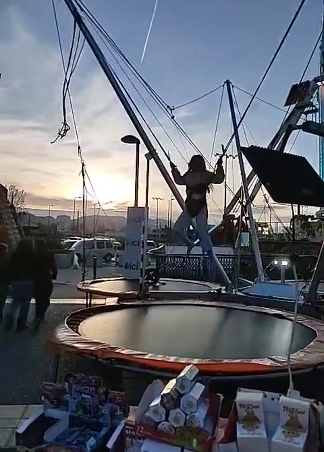 carnival with several attractions. A woman is jumping on a bungee trampoline, attached to wires and performing flips. The camera pans to a large pendulum ride, which is decorated with lights and is swinging back and forth. There are people standing in line to ride the pendulum. The scene is set against a backdrop of buildings and a sunset.