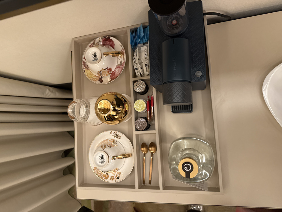 A beige drawer, viewed from above, contains tea and coffee preparation items. There are two delicate teacups with saucers, a glass, a gold colored sugar bowl and spoons. The drawer also contains coffee pods and sugar packets, alongside a dark blue Nespresso machine and a carafe, each neatly arranged in separated compartments.