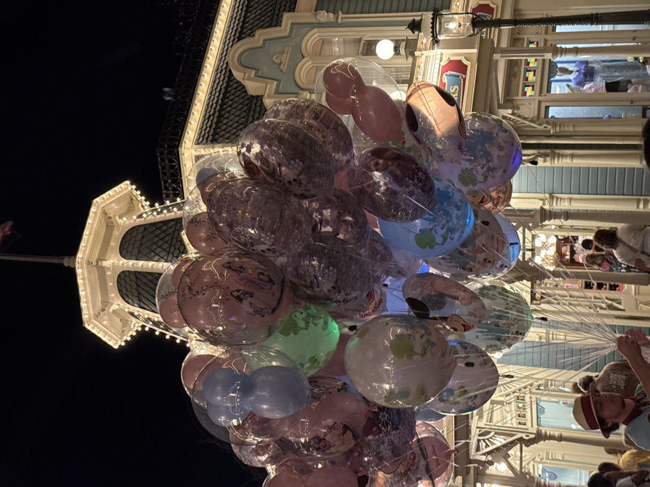 The image displays a nighttime scene on Main Street, U.S.A., at Magic Kingdom Park in Orlando, Florida, United States. In the foreground, a dense cluster of approximately 30-40 helium-filled balloons is prominent. These are predominantly clear "bubble" balloons containing smaller colored balloons (pink, blue, green) or glitter, with various printed Disney character designs, including Mickey Mouse and princesses. Several balloons exhibit internal light sources, emitting glows of various colors. A male vendor, appearing light-skinned, is positioned in the lower-left foreground. He wears a light-colored fedora with a striped band and a light blue polo shirt with a dark collar, holding the bundled strings of the balloon cluster with both hands, his gaze directed downwards or slightly left. Indistinct forms of multiple park guests are visible in the mid-ground and background, walking or standing. The background features two-story, Victorian-style buildings, characteristic of the theme park's architecture. These structures are extensively outlined with warm-toned string lights along their cornices and rooflines. A prominent, octagon-shaped cupola, also illuminated by string lights and topped by a small flag, rises against the dark, cloudless night sky. On the right, an ornate black street lamp with an illuminated incandescent bulb is visible. Shop windows in the background display merchandise and mannequins, including one wearing a light purple top and light blue bottoms.