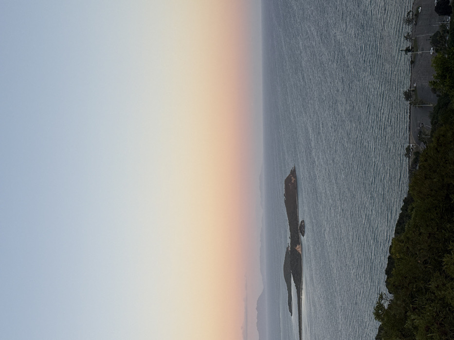 The image depicts an elevated panoramic view of a coastal scene in Noumea, New Caledonia, France, likely from Ouen Toro Hill, overlooking Anse Vata bay. The upper two-thirds of the frame show a graduated sky, transitioning from light blue at the zenith to a pastel orange and pink hue near the horizon. The central portion features an expansive body of dark blue-grey water with discernible ripples. Within this water, two primary dark, tree-covered islets are visible in the mid-ground, with a smaller, rounded islet positioned closer to the foreground. The larger of the two prominent islets exhibits a small, light-colored sandy area on its eastern flank. Faint, hazy blue-grey landmasses are visible on the distant horizon to the left. The lower quarter of the image consists of dark green, dense foliage, suggesting an elevated viewpoint. Below this vegetation, a grey asphalt parking lot is visible, featuring white parking space markings, several utility poles with lights, and approximately five light-colored vehicles parked. The parking lot abuts a dark, rocky or concrete shoreline that meets the bay. No individuals are visible. The lighting conditions suggest either sunrise or sunset.