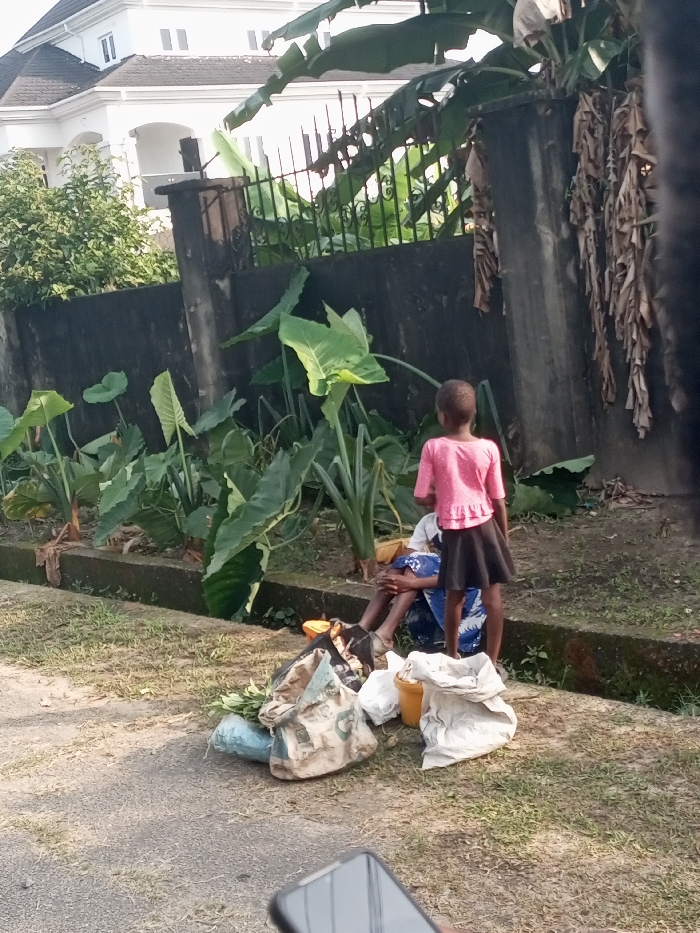 A child in a pink top and black skirt stands next to an adult seated on a curb. The adult is wearing a blue patterned garment. Several bags and containers are on the ground beside them, possibly containing goods for sale. A concrete wall with lush green plants and trees behind it stretches across the background. The corner of a building is visible in the upper left. A mobile phone is slightly visible in the lower portion of the photo.