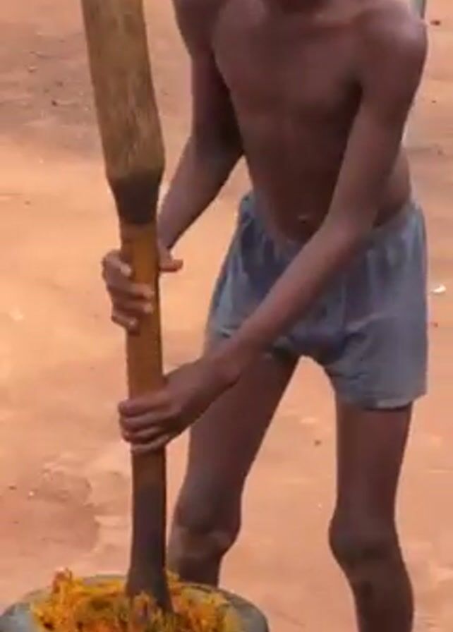 A young, shirtless person wearing gray shorts uses a long, wooden pestle to pound a yellow-orange substance in a stone mortar. The scene takes place outdoors on a red dirt surface. A large, dark-colored pot containing yellow liquid sits nearby. In the background are simple buildings, a basket, and green vegetation. A yellow garment is hanging under a simple shelter made of posts and a sheet of corrugated metal. The person is focused on the pounding motion.
