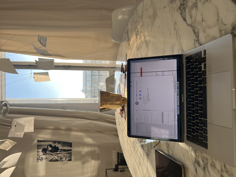 The scene depicts an interior space, likely an apartment or office, illuminated by strong natural light originating from a large window in the background. A white marble table occupies the foreground. An open silver MacBook Pro laptop is positioned centrally on the table, displaying an email client interface. The screen exhibits a prominent vertical black line defect. An email titled "Coordination BBG Recherche 93 Rue Vaugirard Bateliers" is visible within the email client. To the left of the laptop are a partially visible dark tablet or smartphone and a clear glass of water. A golden, reflective, conical object rests further back on the table. Beyond the table, a large window provides a clear view of an urban landscape under a bright, cloudless blue sky. The distinctive dome of Les Invalides is visible on the horizon, confirming the location as Paris, France. White, floor-length curtains are drawn to either side of the window. Suspended from a ceiling fixture above the table are several small, light-colored paper squares or notes, attached by thin wires. On the wall to the left, a framed black and white artwork depicting a stylized figure with intricate patterns is mounted. Portions of white, modern chairs are visible around the table. No individuals are present in the image.