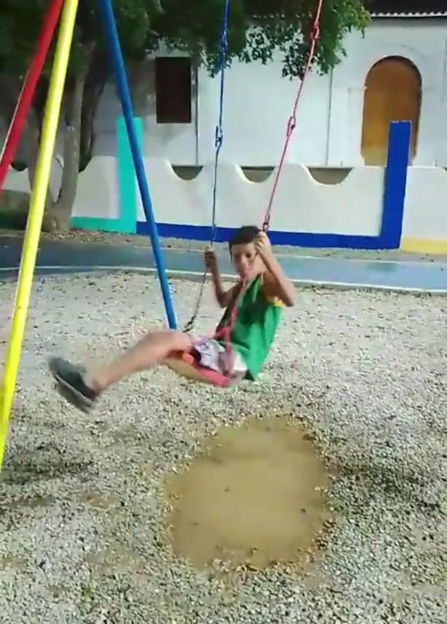 - "A young boy in a green tank top and patterned shorts swings on a swing set in a gravel-covered playground" by FM-ymGPj1, licensed under CC BY 4.0