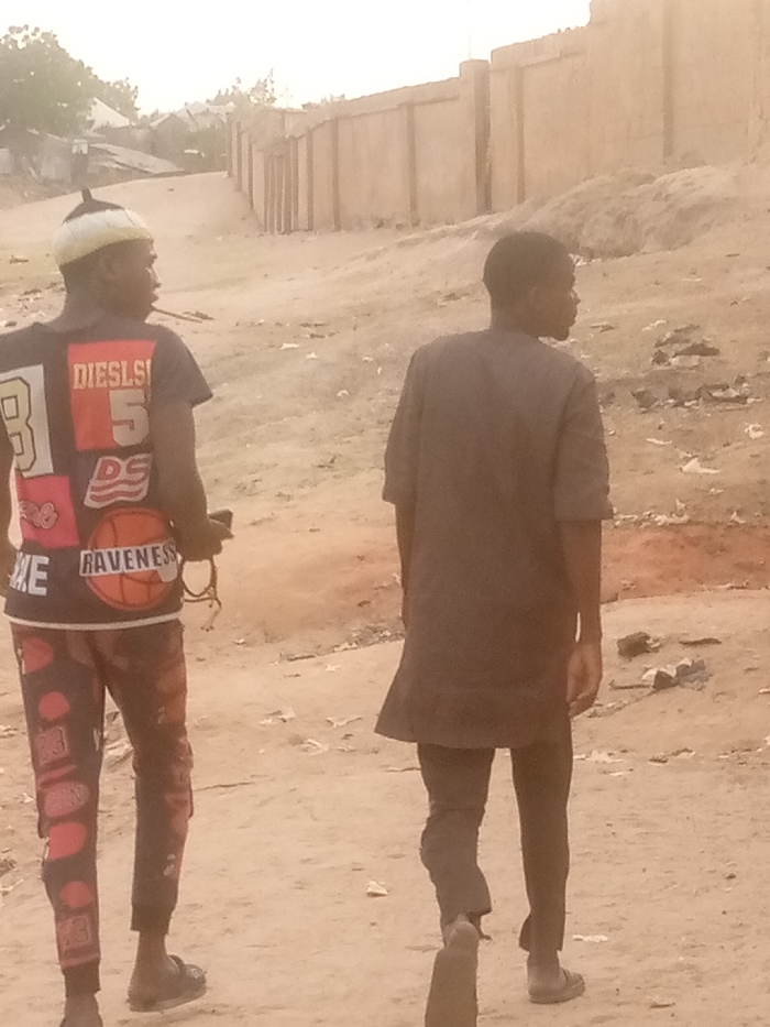 This image depicts two males walking on an unpaved, sandy path in Pantame, Nigeria