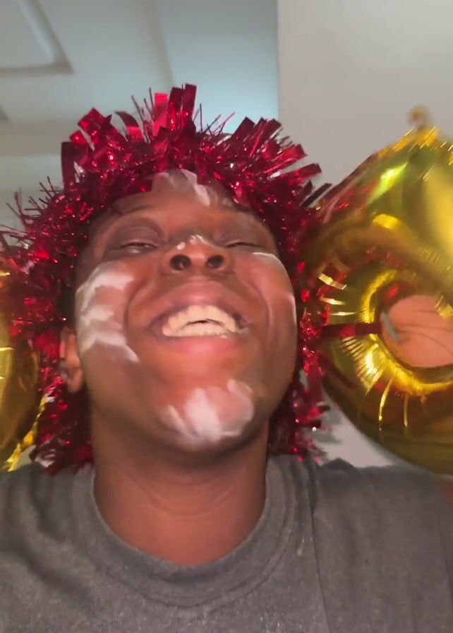A close-up video shows a person with dark skin, red festive tinsel around their head, and white cream smeared on their face, smiling broadly at the camera. They are wearing a gray shirt. They hold gold, number-shaped balloons on either side of their head. The background is a white ceiling with a recessed light fixture. The person appears to be celebrating.
