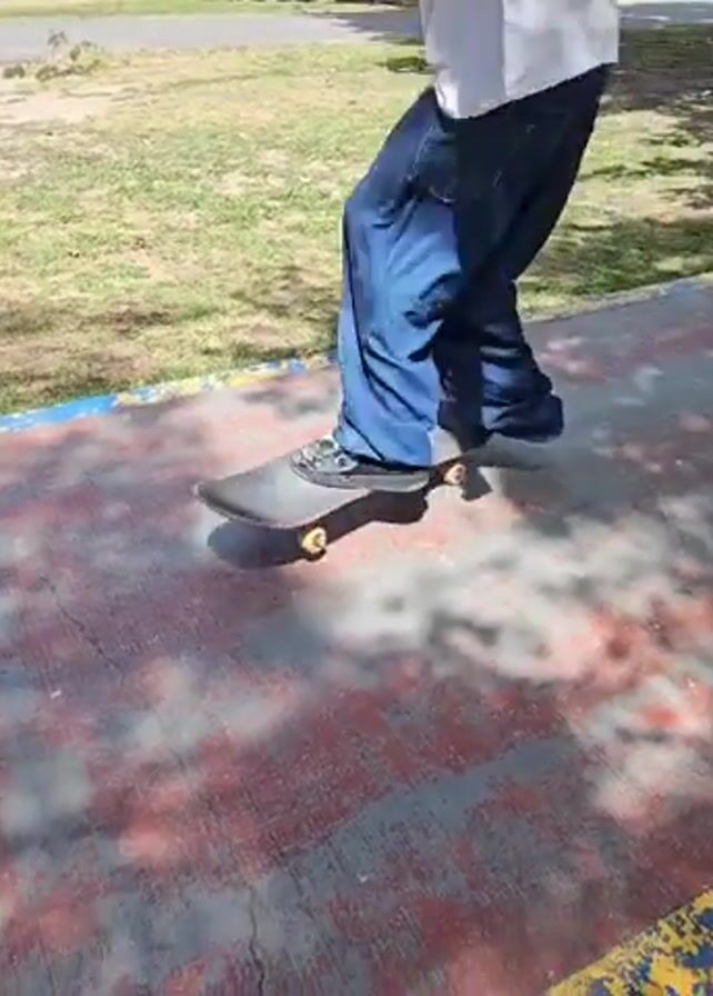 A skateboarder in blue jeans and a white shirt is performing an ollie trick on a skateboard. The skateboarder is standing on a paved walkway with a colorful border. The area surrounding the walkway includes grass and trees. The camera appears to be stationary, capturing the trick from a low angle. Sunlight filters through the trees, creating shadows on the walkway.