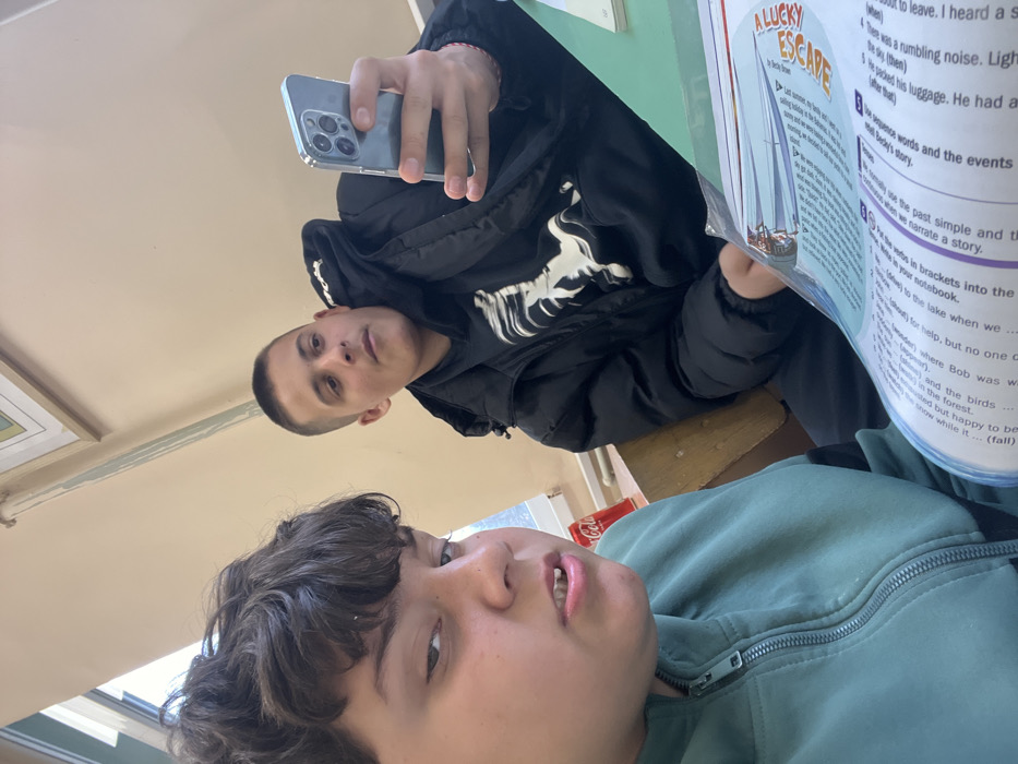 Two male individuals are present in an indoor setting, likely a classroom or study area, in the city of Berkovitsa, Bulgaria. The individual in the foreground, positioned to the left, has dark hair, a youthful appearance, and wears a teal-colored zip-up jacket. He is looking directly towards the camera, mouth slightly open, revealing teeth. To his right and slightly behind him is a second individual with short, dark hair and a youthful appearance, wearing a black puffer jacket over a black hoodie with a white graphic design. This individual is holding a light blue/grey smartphone with a clear case and multiple camera lenses in his right hand, directing his gaze towards the phone's screen. A red string bracelet is visible on his left wrist. On the green-topped desk in front of the second individual, a textbook or workbook titled "A LUCKY ESCAPE" is open, displaying English text and an illustration of a sailboat. Behind the first individual, a red Coca-Cola can rests on a wooden surface next to a window, which provides natural light. The room features light-colored walls, and a framed item is partially visible on the wall in the upper right background. The general environment indicates a daytime indoor scene.
