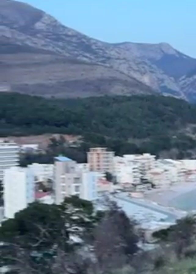 n elevated perspective of a coastal town nestled against a backdrop of mountains. The town features a mix of residential and commercial buildings, predominantly white or light-colored with red-tiled roofs. A beach borders the town, with the sea visible in the distance. The mountains, covered in patches of green vegetation, dominate the skyline. The sky is a light blue, indicating either early morning or late evening. The foreground consists of sparse greenery, suggesting the vantage point is from a hillside.