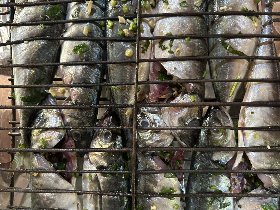 - "The image displays a close-up, top-down view of approximately ten to twelve small, whole fish arranged within a metal grilling basket or rack" by FM-EXOi83, licensed under CC BY 4.0