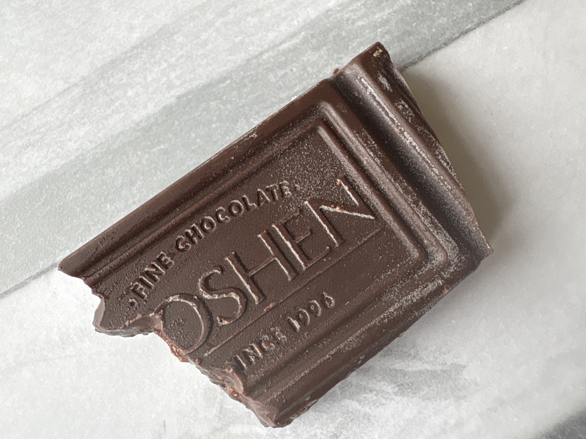 A partially eaten square of dark chocolate sits on a light grey surface with subtle white marbling. The chocolate is molded with the word "OSHEN" prominently displayed in uppercase letters, above "SINCE 1996", and "FINE CHOCOLATE" in smaller print along the top edge. A bite has been taken from the bottom left corner of the chocolate. The scene is not identifiable as any location in the city of Tryavna, Bulgaria.
