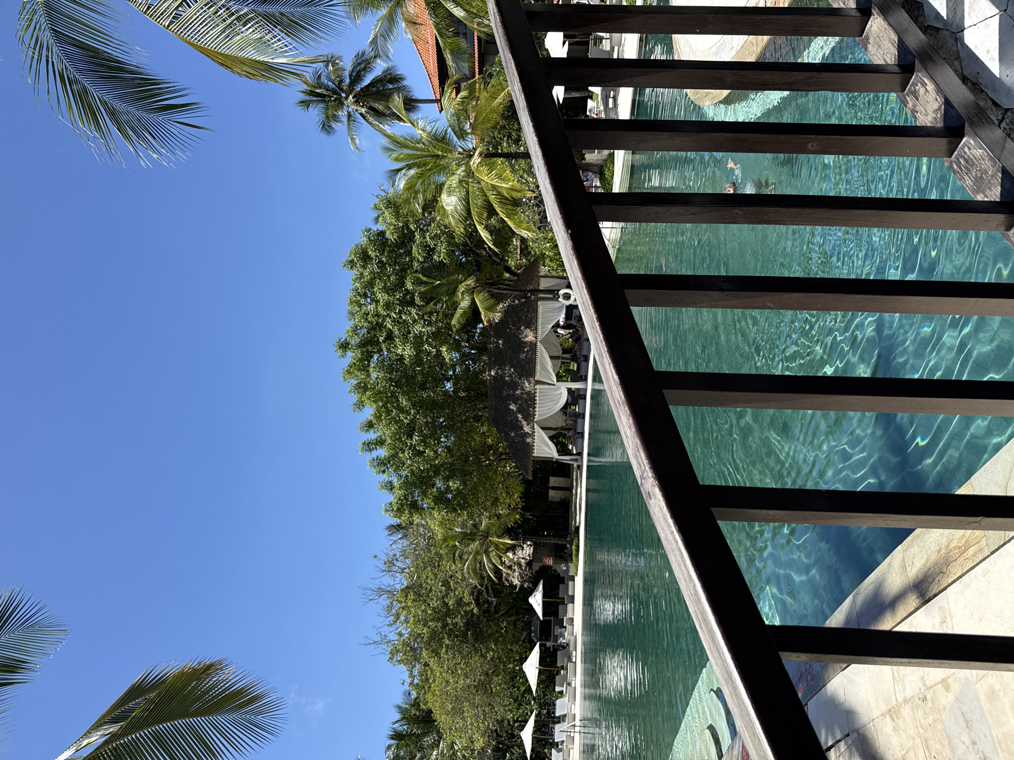 The image captures a scene at a resort in Nusa Dua, Indonesia. In the foreground, a dark brown wooden railing partially obstructs the view. Beyond the railing, a long, rectangular swimming pool filled with clear turquoise water stretches into the distance. A person is visible swimming in the pool. White canopies and lounge chairs line the edge of the pool. Lush tropical vegetation, including palm trees and dense green trees, borders the pool area. The sky is a clear, bright blue. A partial view of a red-tiled roof is visible among the trees. The image gives the impression of a sunny, tropical vacation setting.