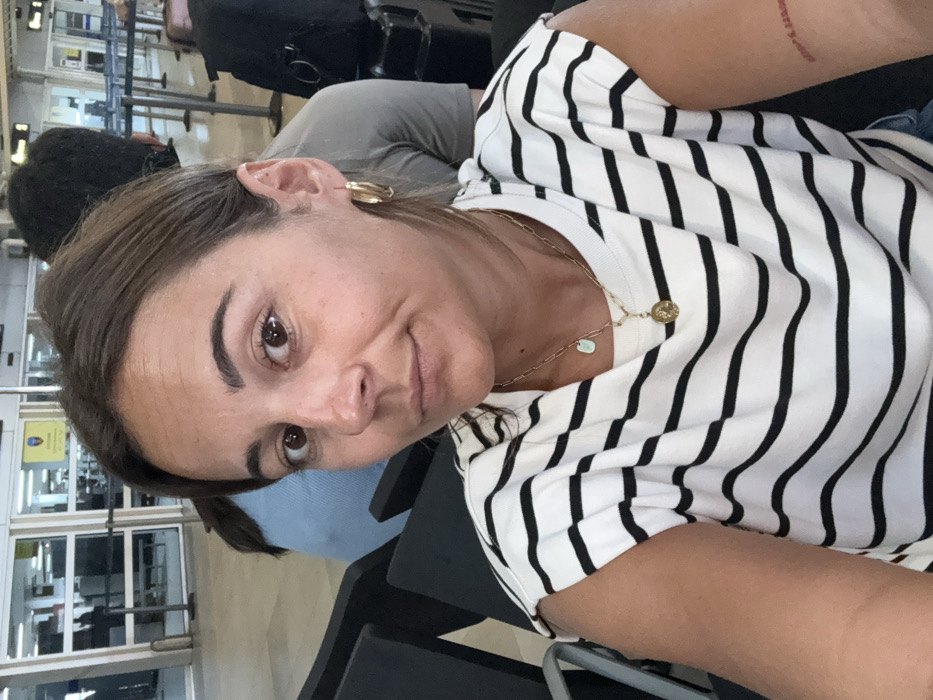 A woman with brown hair and eyes is wearing a black and white striped shirt and a gold necklace. She has a gold earring in her left ear. She is sitting in a black chair in an airport, with other people and luggage behind her. The woman is looking at the camera with a slight smile.