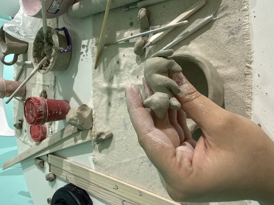 The image depicts a close-up, high-angle view of a pottery studio workspace located in Yerevan, Armenia. A human hand, visibly smudged with clay, is centrally positioned, holding a small, unfired clay sculpture of a reclining cat. The hand and the clay cat are positioned above a small, unfired, circular clay bowl. The workspace consists of a white table mostly covered by a light beige, textured fabric mat. On the table, various items related to pottery are scattered: multiple irregular lumps of raw clay, two red plastic containers with lids (one appearing well-used), a light-colored bucket containing wet clay or slip with a wooden stick resting across its rim, and several distinct pottery sculpting tools including metal and wooden instruments. To the left, several wooden slats or rulers are arranged, one bearing the inscribed number "6". A partially visible, unfired clay mug is in the upper right background. The upper background reveals a light blue-green wall.