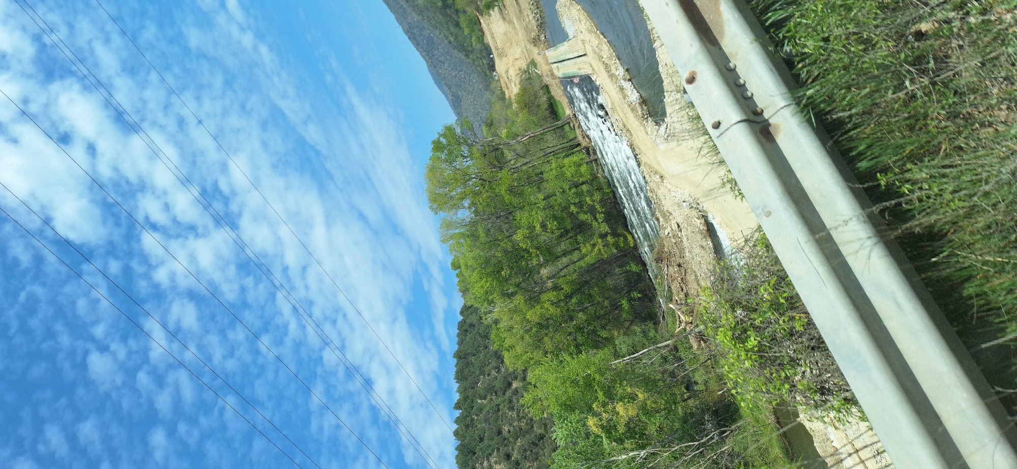 view in Kresna, Bulgaria, encompassing a blend of natural and infrastructural elements. The foreground features a metal guardrail. Beyond this, a steep, verdant hillside covered with trees slopes down towards a water channel, presumably a river or canal. Along the watercourse, there is evidence of construction or landscaping. In the distance, a mountain rises, adding depth to the landscape. In the upper left corner, power lines stretch across a cloudy, blue sky.