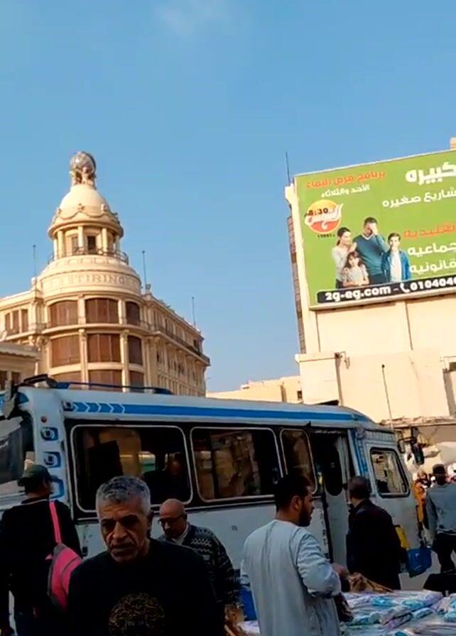 A camera looks up at a tall, tan, ornate building with an orb-shaped dome on top. In front of the building, several people are standing around a white and blue bus. Many of the people are looking at and boarding the bus, while others are standing around talking or looking at their phones. The sky is blue. There is a yellow billboard with Arabic writing on it. There are people setting up merchandise at what appears to be a market.