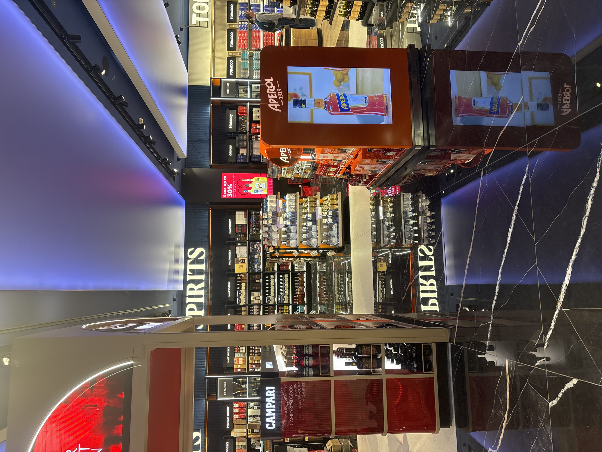 Here is a forensic description of the image: The image presents the interior of a duty-free shop, likely located at an airport, specializing in alcohol and tobacco products