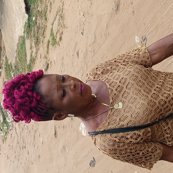 A female individual is depicted walking on an unpaved dirt road in Umuode, Nigeria. The woman, appearing to be middle-aged or older, has dark skin and is wearing a vibrant fuchsia-colored curly hair extension styled as an updo, with braided sections on the sides of her head. Her gaze is directed downwards and slightly to her right. She has plum-colored lipstick on her lips. She is adorned with small, faceted silver-toned hoop earrings, a gold-colored choker, and a longer gold-colored necklace with a spiral heart-shaped pendant. Her attire consists of a short-sleeved, light brown or tan top featuring an intricate cut-out pattern. A dark strap from a shoulder bag is visible over her left shoulder. The ground surface is composed of packed dirt with visible tire tracks and scattered refuse, including bits of plastic and organic material. Sparse vegetation and indistinct structural elements are visible in the background, further from the subject.