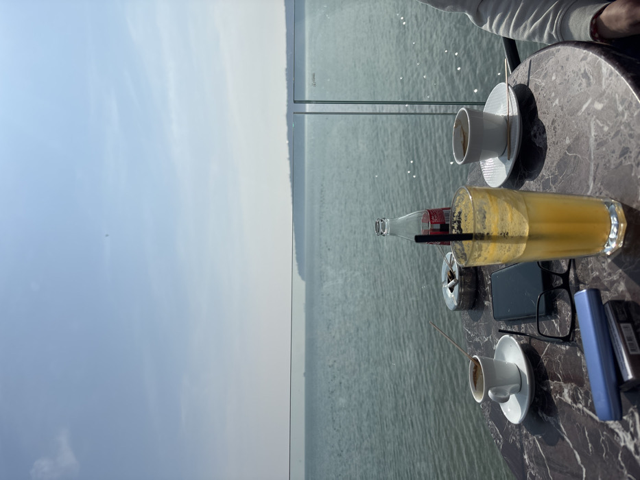 The image depicts an outdoor dining or lounge area on a clear, sunny day overlooking the Black Sea in Varna, Bulgaria. The perspective is from a table, partially occupied by an individual whose right arm is visible on the far right. The foreground is dominated by a dark, mottled marble-patterned round table laden with beverages and personal items. From left to right: a white demitasse cup with a white saucer, containing a dark liquid (likely coffee) and a stirring stick; an open metal ashtray holding a cigarette butt and ash; a black smartphone; a pair of black-rimmed eyeglasses; a blue vape pen; and a cigarette pack (Marlboro brand visible). In the center, a tall glass filled with an orange/yellow beverage (likely juice) containing pulp and a black straw is prominently displayed. To the right of the juice glass, an empty glass Coca-Cola bottle with a red label and a black straw is present, alongside another white demitasse cup with a white saucer, also containing a dark liquid and a stirring stick. The midground features a clear glass railing, indicating an elevated position, separating the table area from the expansive body of water. Reflections and glints are visible on the glass. The water, the Black Sea, shows small ripples across its surface and reflects sunlight. In the distance across the water, a hazy landmass or coastline is visible, consistent with the geography around Varna Bay, possibly a cape. Several dark, indistinct shapes, likely ships or distant structures, can be faintly discerned on the horizon line above the water. The background consists of a clear, light blue sky with minimal atmospheric haze, suggesting fair weather. The overall scene conveys a moment of leisure on the Varna coast.