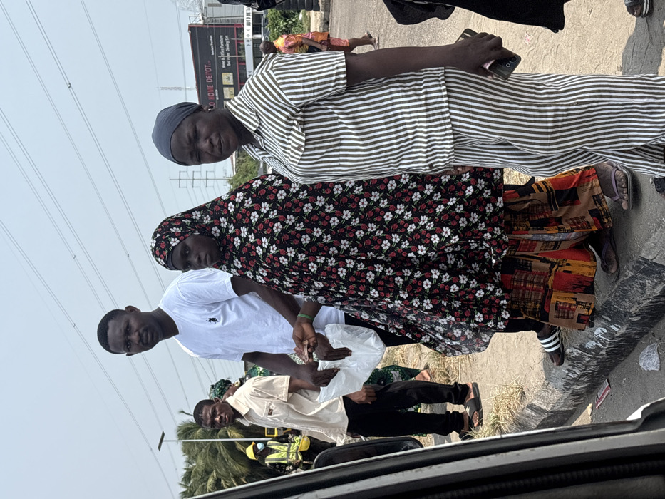 This image captures an outdoor street scene in Ilado, Nigeria, under a clear sky. A group of individuals stands near a concrete curb, adjacent to a vehicle partially visible on the far left. From left to right, the prominent figures are: 1. A male in a light beige short-sleeved shirt and dark trousers, wearing dark slide sandals, looking towards the left side of the frame. 2. A male in a white short-sleeved polo shirt with a dark logo, dark trousers, and dark slide sandals, looking directly forward. He holds a clear plastic bag in his left hand and extends his right hand towards the adjacent female. 3. A female in a black hijab and long dress patterned with red and white flowers, worn over a multi-colored patterned skirt in brown, orange, and black. She wears dark open-toed sandals and looks slightly left, towards the man in the white shirt, with her right hand positioned near his extended hand. 4. A female in a matching short-sleeved top and trousers with vertical olive green and white stripes, a dark grey headwrap, and dark open-toed sandals. She looks directly forward, holding a smartphone in her right hand. In the background, power lines span across a light grey sky. A large billboard displaying "HOME DEPOT" and text related to furniture is visible. Green foliage and structures are present in the distance. A person wearing a yellow safety vest is partially visible behind the man in the beige shirt, and another person in an orange patterned garment is partially visible on the far right background.
