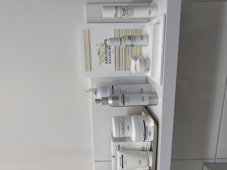 The image displays an indoor setting featuring a collection of cosmetic products arranged on a white shelf or counter. The background consists of a plain white wall. The primary subjects are various white and silver containers of beauty products from the brand "Biologique Recherche Paris," identified by visible branding and product names. On the left, a rectangular silver tray holds a white tube labeled "MASQUE VIVANT" and two white jars, one on top of the other, identified as "CRÈME MASQUE VERTEZ MS" and "MASQUE VIVANT," respectively. To the right of the tray, a tall silver spray bottle labeled "L'EAU OXYGENANTE" stands next to a taller white spray bottle, also from Biologique Recherche, with "PROFESSIONNEL" text visible. Further to the right, a white display stand elevates a small white jar, partially labeled "BIOKISS," and a white pump-top bottle identified as "SÉRUM ÉRYTHROS." Behind these items on the stand is a vertical white sign featuring the "BIOLOGIQUE RECHERCHE PARIS" logo and text in gold. On the far right, a tall white bottle is labeled "CRÈME CONTOUR YEUX ET LÈVRES BIOMIMÉTIQUE." No individuals are present in the scene, and no specific actions or interactions are depicted. The environment is clean and brightly lit, consistent with a retail display or professional spa/salon setting. The specific location within the city of Lublin, Poland, cannot be determined from the visual information provided in the image.