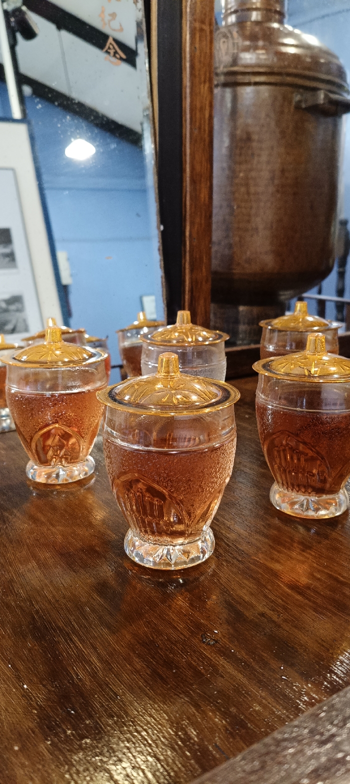 Several small glass jars with amber-colored liquid and golden lids sit on a glossy, dark wooden surface. Reflected in a mirror behind them is a copper samovar-like container. The background shows a blue wall and a framed picture. The jars are arranged in a slightly staggered line, with the focus on the ones closest to the viewer, showcasing their intricate design.