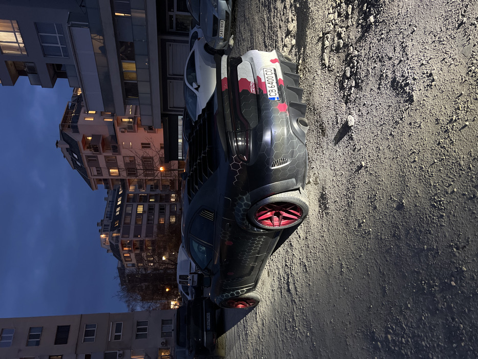 The image depicts an outdoor urban scene at dusk or night in Sofia, Bulgaria. A highly customized black Dodge Charger is the central subject, parked on an unpaved surface consisting of gravel and dirt. The vehicle is adorned with a dark grey and black hexagonal pattern vinyl wrap on its body, complemented by prominent red multi-spoke wheels. Its rear features black louvers over the rear window, a rear spoiler, and a rear bumper diffuser housing dual exhaust outlets. Above the diffuser, a distinct red and white camouflage pattern is visible, adjacent to the Bulgarian license plate "CB 6400 CO". Artificial illumination from a source positioned to the left casts light across the car's side and the immediate ground. In the background, several multi-story buildings, consistent with residential or mixed-use structures in an urban setting, display illuminated windows. Other vehicles are parked in the vicinity; a white coupe and a silver sedan with Bulgarian license plate "CA 8116 KX" are visible to the right of the Charger, while a dark pickup truck with plate "CB 6795 AJ" is partially visible to its left. No individuals are present in the frame.
