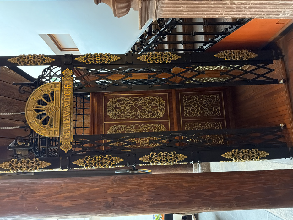 An ornate elevator gate, featuring gold filigree on black metal, spells out "ELEVADOR" vertically on its side