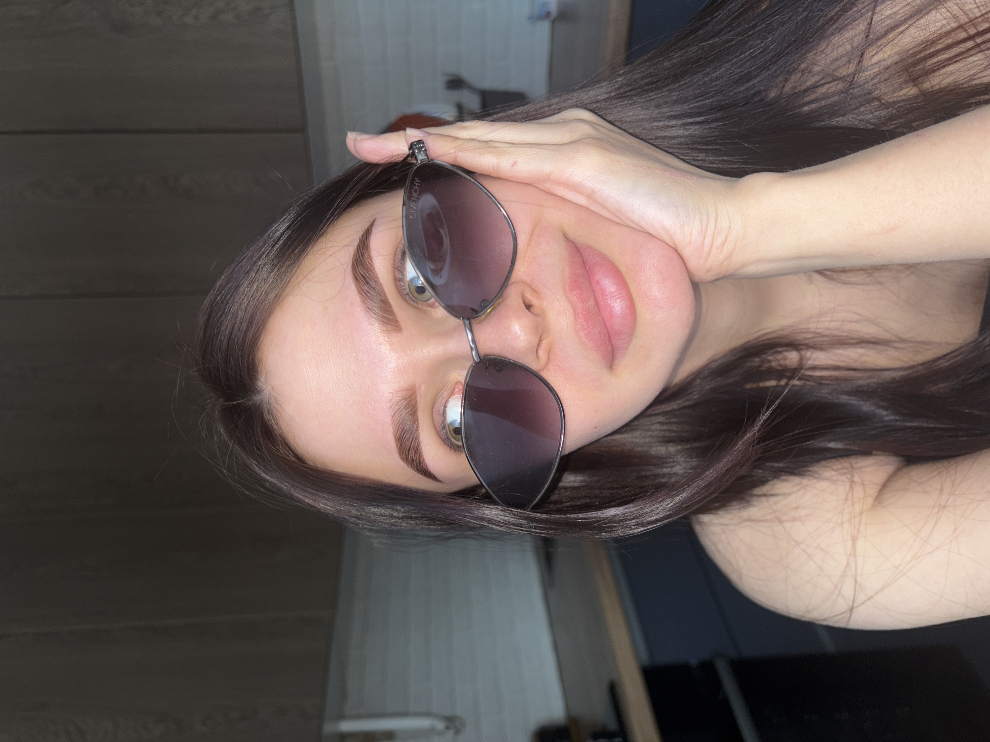 A young adult female is depicted in a close-up, medium shot, positioned indoors within a kitchen setting in the city of Chaikovsky, Russia. The subject has long, dark brown hair and fair skin. She is wearing dark, cat-eye style sunglasses with thin silver frames, featuring the "GIVENCHY" brand name visible on the upper right lens. Her right eye, visible above the sunglasses, has a light-colored iris, and her gaze is directed upwards and slightly to her left. Her eyebrows are dark and well-defined, and her lips are full with a pink hue, forming a slight smile. Her right hand supports her chin, with fingers resting against her temple and cheek. She is wearing a dark, possibly black, garment visible on her shoulder and upper chest. The background reveals a kitchen with dark upper and lower cabinetry, a light-colored tiled backsplash, and a wooden countertop. Indistinct objects are visible on the countertop.