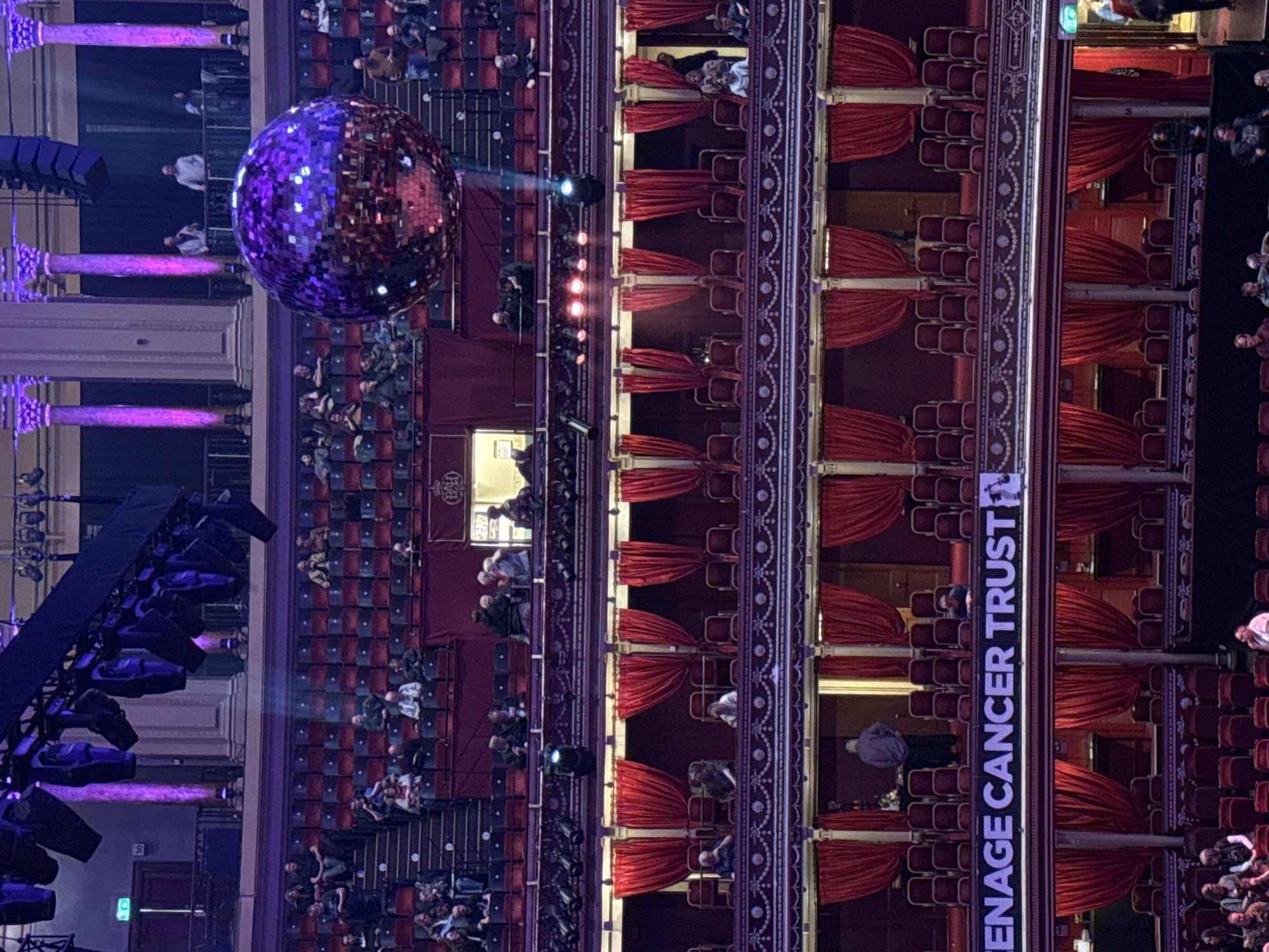 This image depicts the interior of the Royal Albert Hall, located in Kensington, London, United Kingdom. The scene is a multi-tiered circular auditorium, observed from an elevated perspective, showing various levels of seating and architectural details. The upper portion of the frame features a large, dark metal truss system suspended from the ceiling, equipped with numerous stage lights and audio speakers. Beneath this, grand classical columns, illuminated with purple uplighting, rise vertically. A large, spherical disco ball, predominantly purple and silver in color, hangs prominently in the upper-right quadrant, reflecting light. The auditorium itself consists of multiple tiers of red upholstered seating and private boxes, many adorned with red velvet curtains. Intricate, decorative balustrades separate each level. People are scattered throughout the visible seating areas and standing in some boxes and on upper walkways; they appear to be attendees or staff. A prominent, illuminated sign in a central box section reads "ENAGE CANCER TRUST". The overall lighting is artificial, with specific stage lighting elements visible, including a beam of white light striking the disco ball. No specific actions or interactions among the individuals are discernible beyond general presence within the venue.