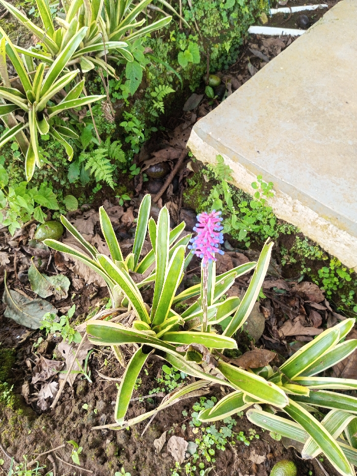 This image displays an outdoor, ground-level scene, presumably within the city of Abbireddygudem, India. A flowering plant, consistent with a Bromeliad species, is prominently featured in the lower-center. This plant possesses a rosette of long, green leaves accented with yellow margins. Emerging from its center is a single stalk, topped with a dense, conical inflorescence composed of numerous small flowers that transition from light pink at the base to light blue towards the apex. To the upper left, another similar variegated plant is partially visible. The ground consists of dark brown soil, interspersed with various small green herbaceous plants, moss, and scattered dry brown leaves. Several dark green, ovoid fruits, approximately avocado-sized, are present on the ground surface. In the upper right quadrant, a light-colored, rectangular concrete or stone structure forms a distinct corner. No human figures or animal life are visible within the frame. The scene is illuminated by natural daylight.