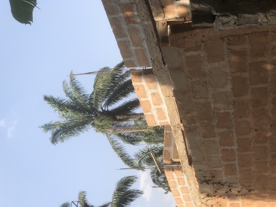The image displays an outdoor scene in Ifitedunu, Nigeria, featuring a partially constructed building wall under a clear, light blue sky