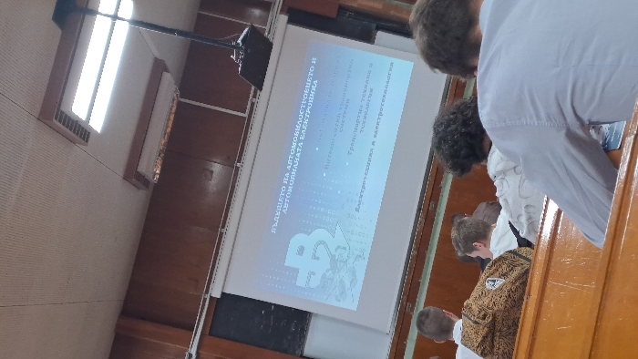 The image depicts an interior view of a lecture hall at the Technical University of Varna, Bulgaria
