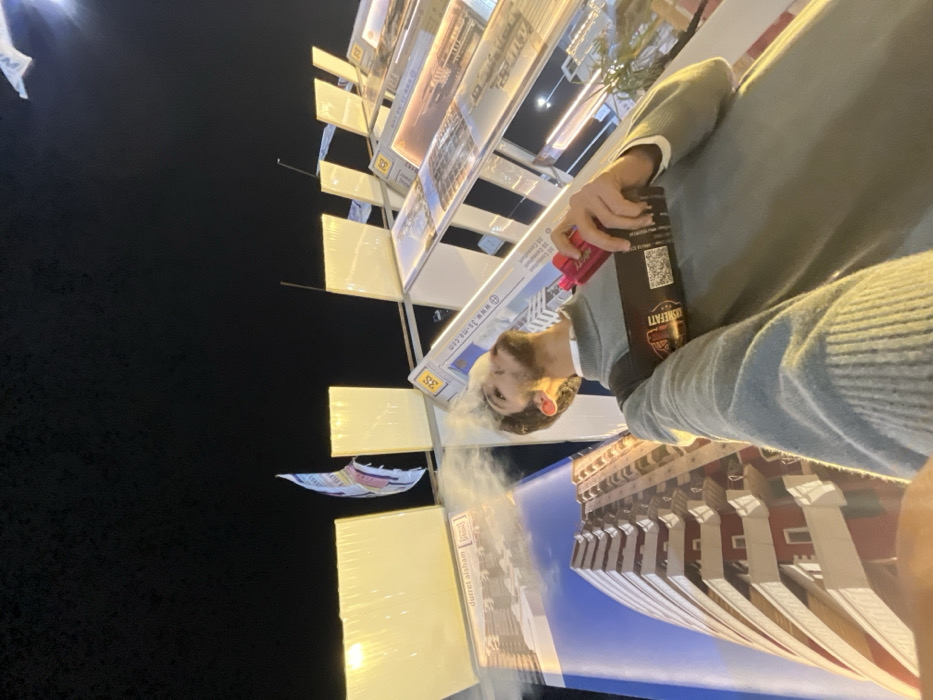 A nighttime image, taken in Shab'a, Syria, captures a male individual amid an outdoor commercial or exhibition display