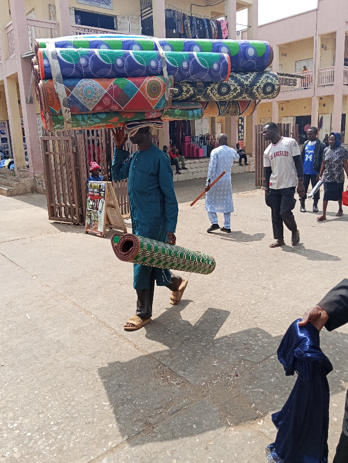 The image depicts a bustling commercial street in the city of Maiburiji, Nigeria, under clear daylight conditions, indicated by strong shadows. In the foreground and central mid-ground, a dark-skinned male, wearing a teal-blue traditional long-sleeved garment over dark trousers and light-colored sandals, walks right-to-left. He carries a significant stack of approximately ten rolled, brightly patterned mats of various colors (green, blue, red, orange, black) secured with white straps balanced on his head. Additionally, he holds a single rolled mat, patterned in green and black stripes, horizontally in his left hand. Several other individuals are present in the scene. To the immediate right of the central figure, a dark-skinned male in a light-patterned traditional long-sleeved garment and dark shoes walks away from the camera, holding a brown stick in his right hand. Further right, a dark-skinned male in a white t-shirt with "LOS ANGELES" text and dark trousers walks left-to-right, followed by another male in a blue "34" jersey and a female in a dark patterned dress carrying a red handbag. In the bottom-right corner, a dark-skinned hand holds a piece of dark blue fabric. In the mid-ground left, a child in a red cap is partially visible behind a brown wooden gate and a vertical display board. The street surface is paved, showing some wear. The background features multi-story buildings with balconies, likely commercial establishments. Clothes are visible hanging on racks on an upper balcony of a building on the left. Inside a shop or open-front store in the background, numerous stacks of pink and red suitcases are displayed.