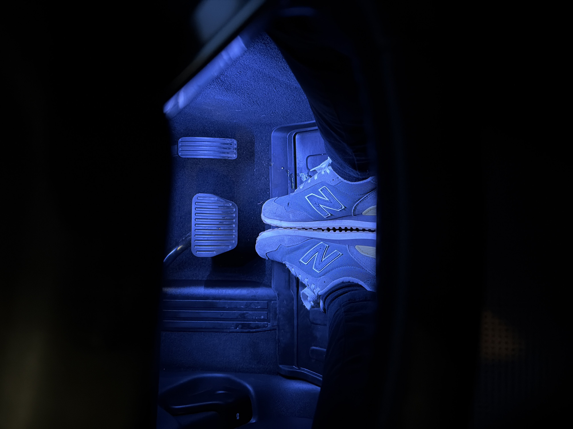 A low-angle, first-person perspective photograph depicts the driver's footwell of a vehicle, illuminated by blue ambient light