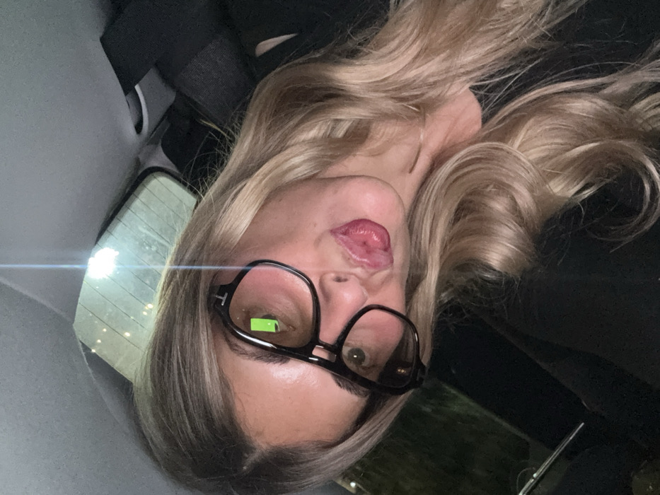 A woman with blonde, wavy hair and green eyes poses indoors. She wears black, oversized glasses. She has her tongue playfully sticking out. She is seated in a car with a gray interior, visible through the back window, with a faint light source appearing outside. The image is taken at an angle, with the camera pointing upward.